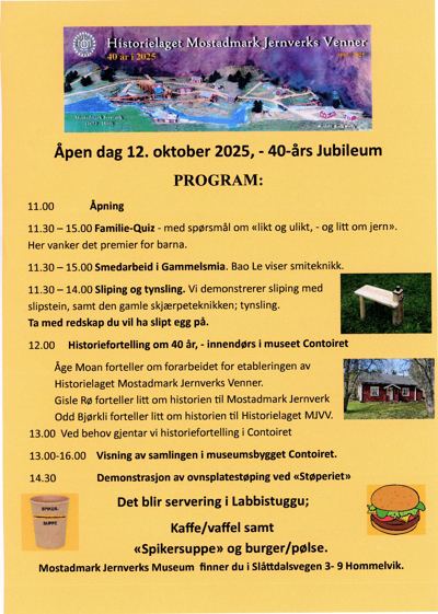 Søndag 12. oktober feirer Mostadmark Jernverks Venner 40-årsjubileum. Alle er velkomne til åpen dag på museet mellom kl 11 og 15. Museet ligger like ved hovedveien mellom Selbustrand og Hommelvik, like nedenfor (nord for) Foldsjøen. Her er programmet for dagen: