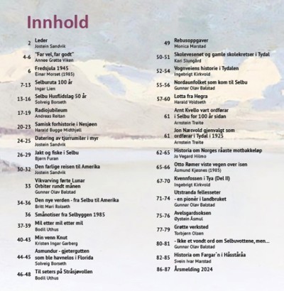 Arkeologene har oppsummert hva de fant av samisk forhistorie da Nesjøen var nedtappet for to-tre år siden. Det er litt jakthistorie, tre artikler knyttet til utvandringa til Amerika, og litt seterhistorie. Fra Tydal er det både skole-, samferdsels- og tidlig kraftutbyggingshistorie, i tillegg til Norges råeste motbakkeløp. Til slutt er det flere artikler knyttet til landbruk- og næringshistorie, bl.a. historia om Fargar´n og farging av tøy i Selbu.